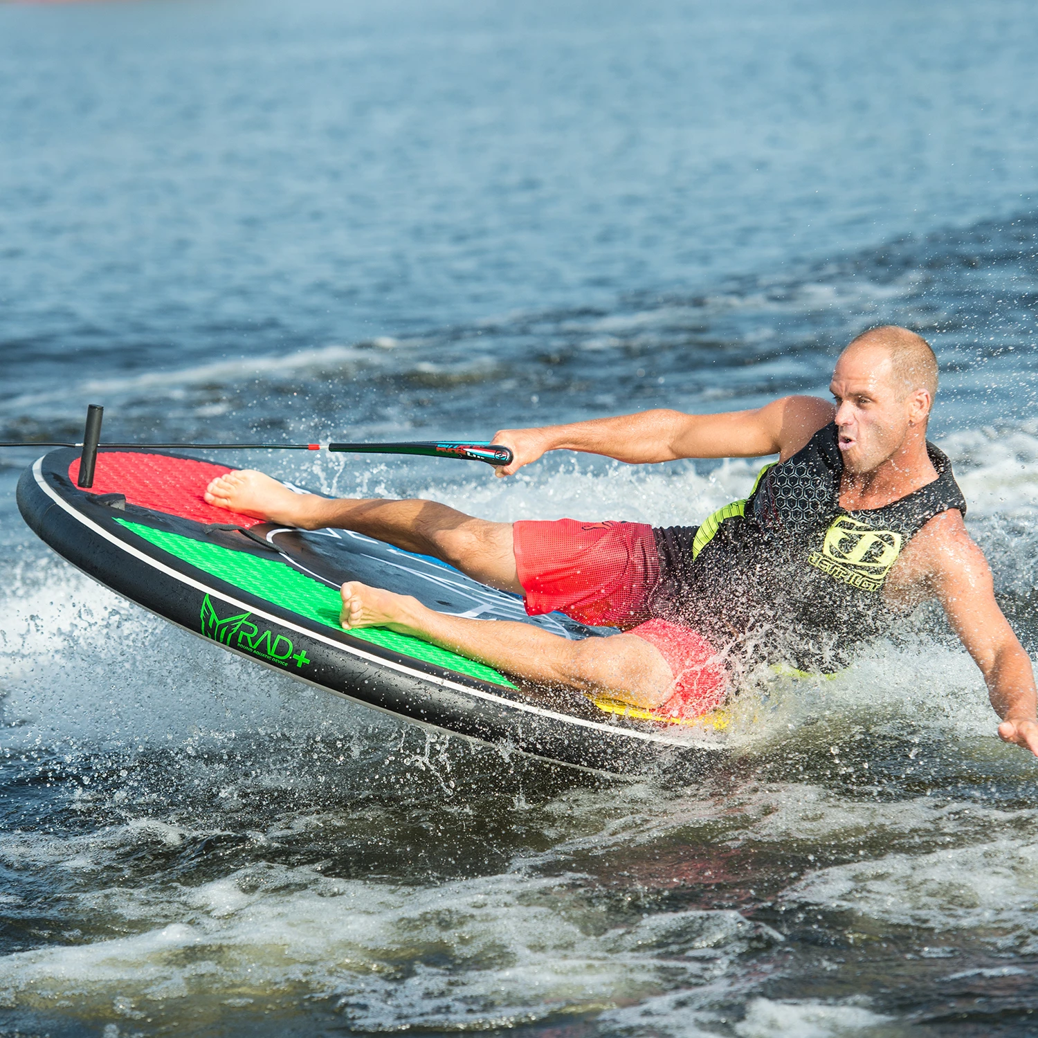 Before wakeboarding was invented, watersports pioneers of the 1960’s experimented with objects to ride behind the boat. Some of the more successful riding devices were wooden discs. Grandpa would take a piece of plywood to his woodshop and cut it into a circular shape. The family would take turns ‘discing’ in between water ski sets. It was a great way to introduce people to riding behind the boat without the learning curve associated with waterskiing. 50 years later, we’ve combined the nostalgia of the past with the advanced materials and construction methods of today to give you the new RAD discs. Round Aquatic Devices (RADs) allow anyone, regardless of skill level, to participate in a day behind the boat. Everyone can get up on the 5’ RAD! You can put the handle in the soft EVA handle hook, sit, stand or kneel, and away you go. For a more advanced ride; go with the 4’ RAD or the even smaller 3’ RAD disc. The riding possibilities are endless, opening up a world of pure imagination on for your friends and family. Fun for all ages, the RADs are guaranteed to turn some heads on your lake this summer.
