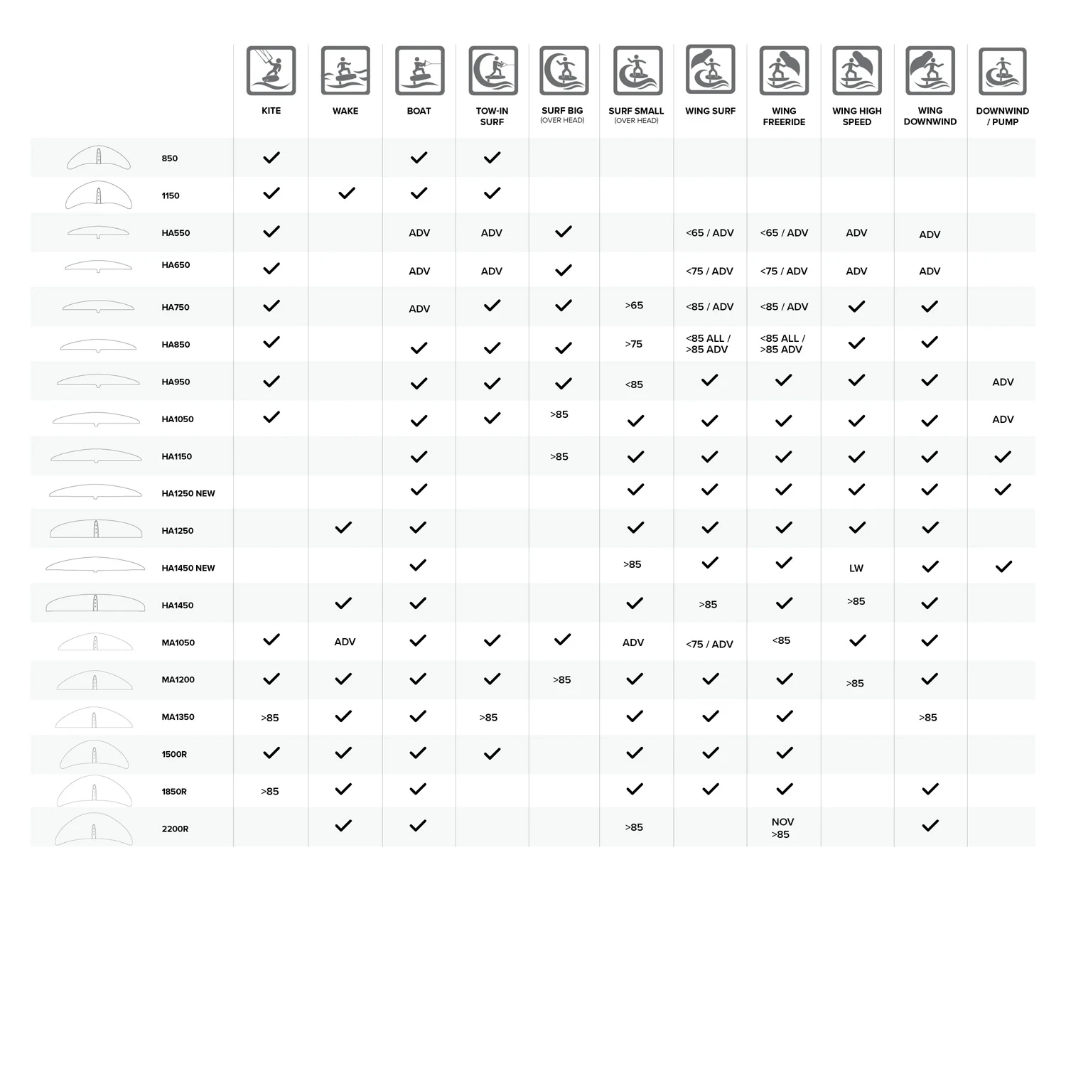 Predictable lift for learning to foil, smooth carvy feel, roll and pitch stability, and impressive control throughout the entire speed range. Larger sizes are ideal for light wind winging.